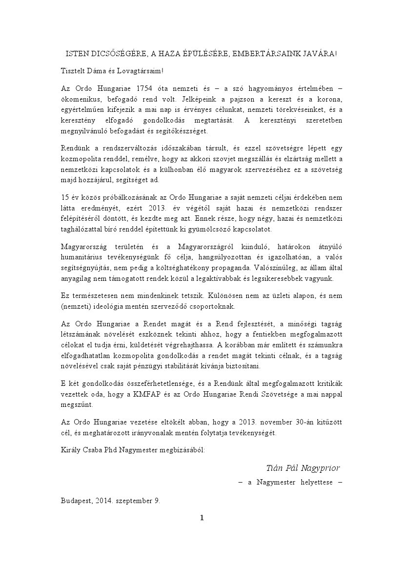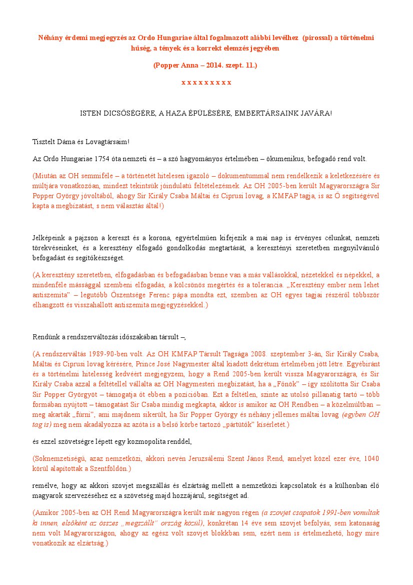 Néhány érdemi megjegyzés az Ordo Hungariae által fogalmazott alábbi levélhez (pirossal) a történelmi hűség, a tények és a korrekt elemzés jegyében.