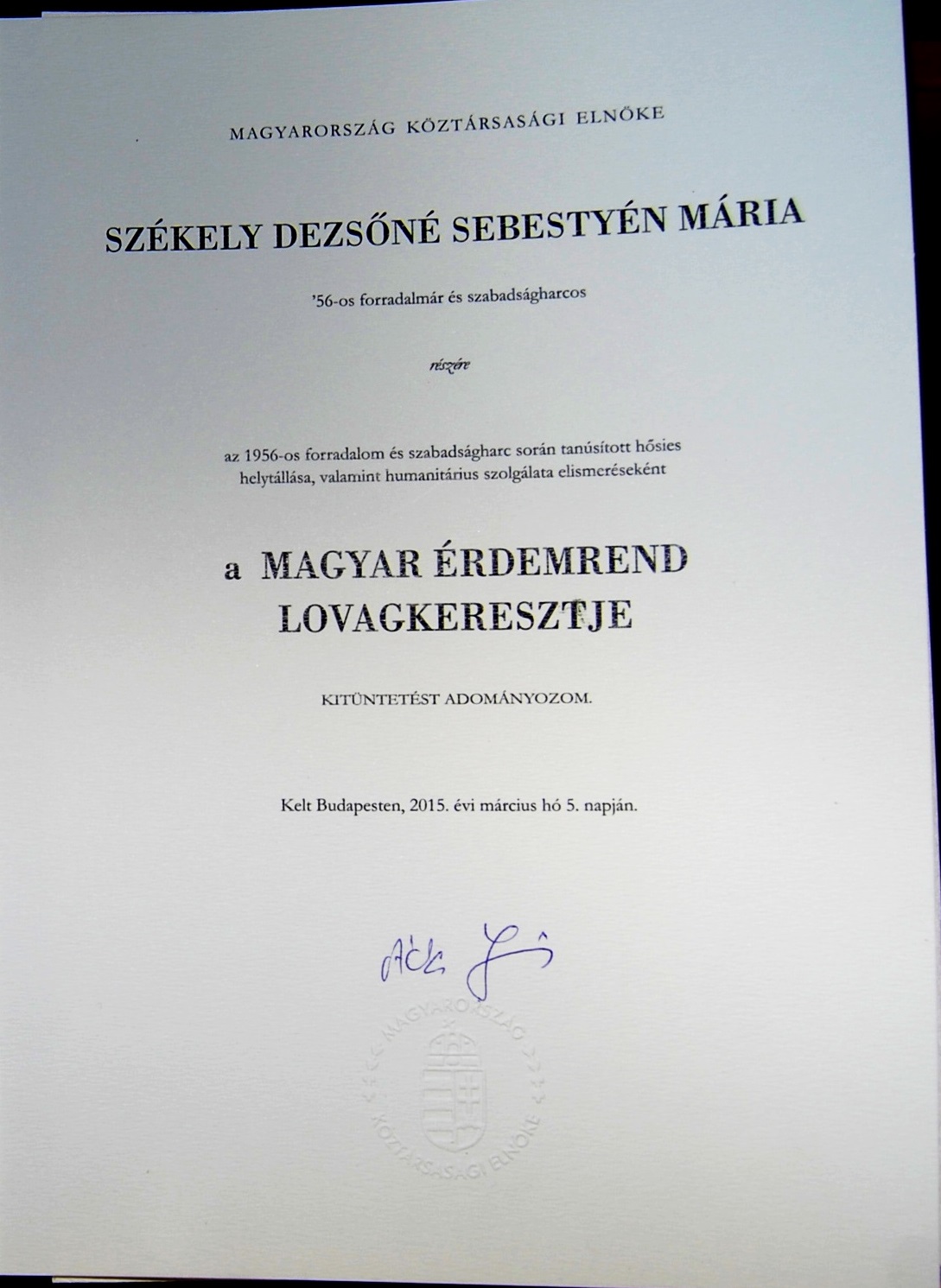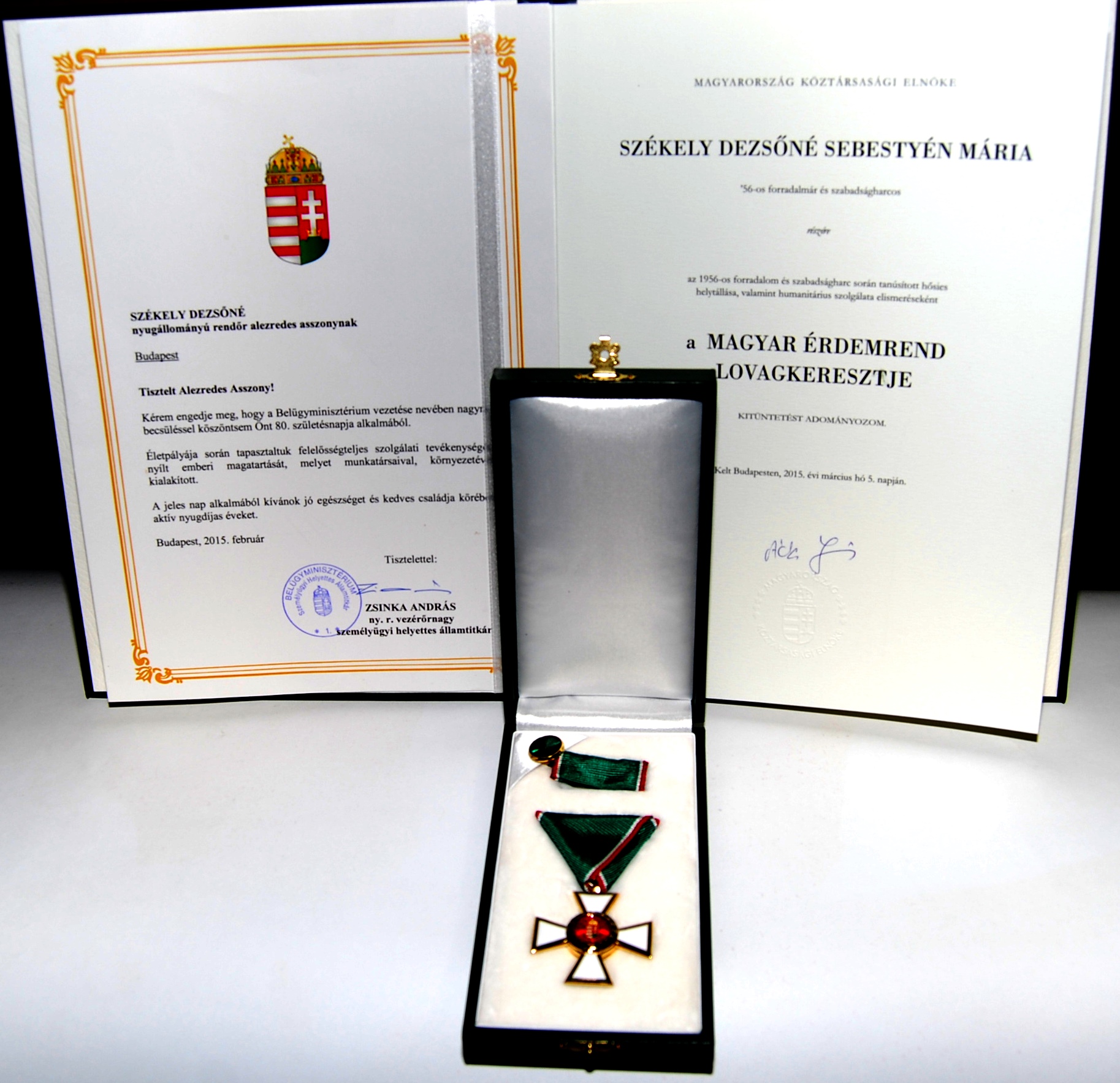 80. születésnapja alkalmából Lady Mária magas állami elismerésben részesült. Áder János köztársasági elnök úr – a belügyminiszter előterjesztésére – nemzeti ünnepünk, március 15-e alkalmából a Magyar Érdemrend Lovagkeresztje kitüntetést adományozta Székely Dezsőné Sebestyén Mária asszonynak az 1956-os forradalom és szabadságharc során tanúsított hősies helytállása, valamint humanitárius szolgálata elismeréséül.