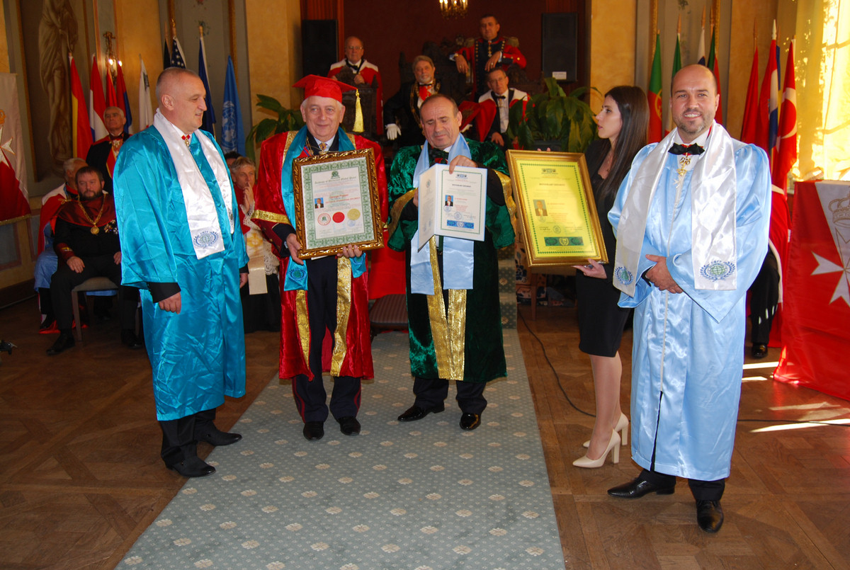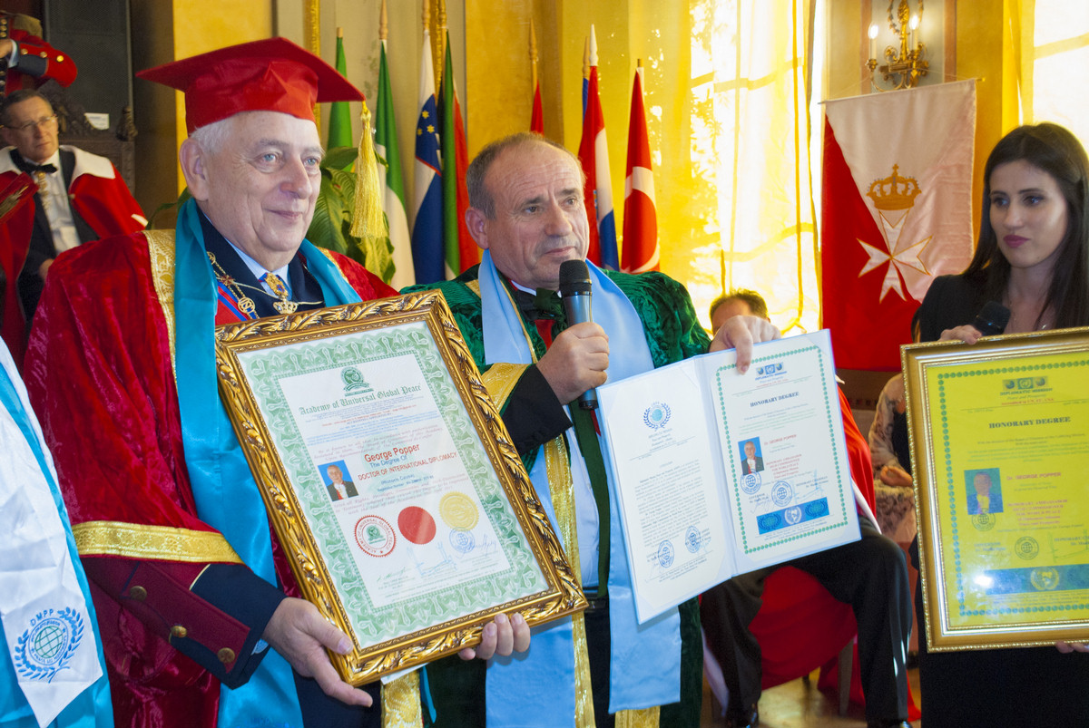 H.E. Shefki Hysa, a DMPP elnöke kért szót, hogy Sir Dr. Alexander Milesz Békenagykövet segítségével átadja H.G. Prof. Popper Györgynek a Tiszteletbeli békenagyköveti és Béke főbiztosi kinevezését. S egyúttal az Academy of Universal Global Peace díszdoktorává avatták, Doctor of International Diplomacy h.c. címet adományozva. Az egyetemet Indi és az USA mellett az ENSZ és az Európai Unió is elismeri. Sir Szalai Tamás Máltai Lovagot a DMPP Tiszteletbeli Béke-főkonzullá avatták.