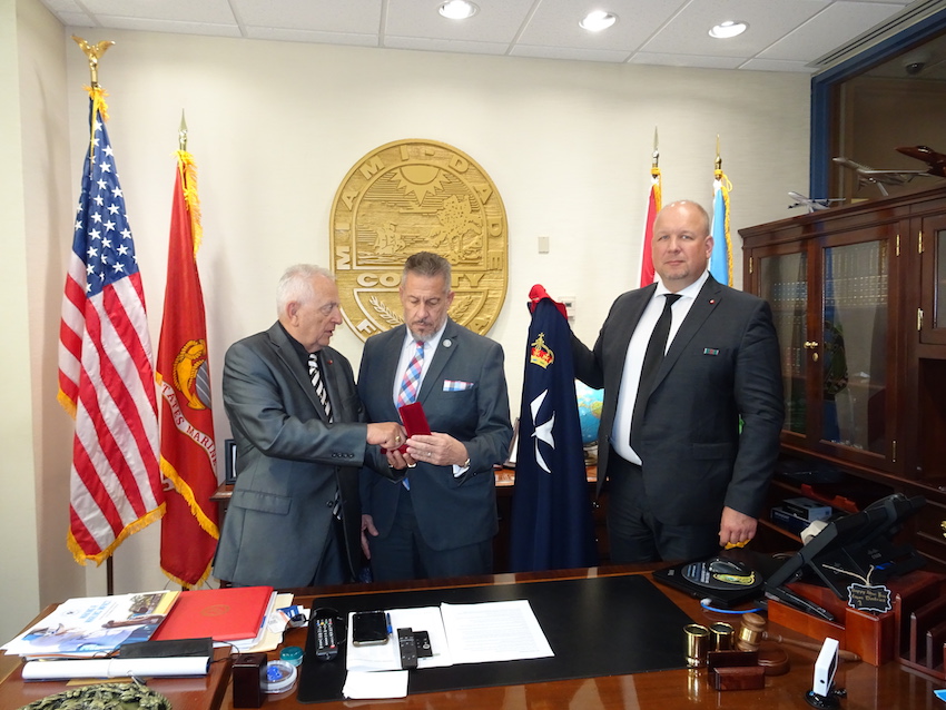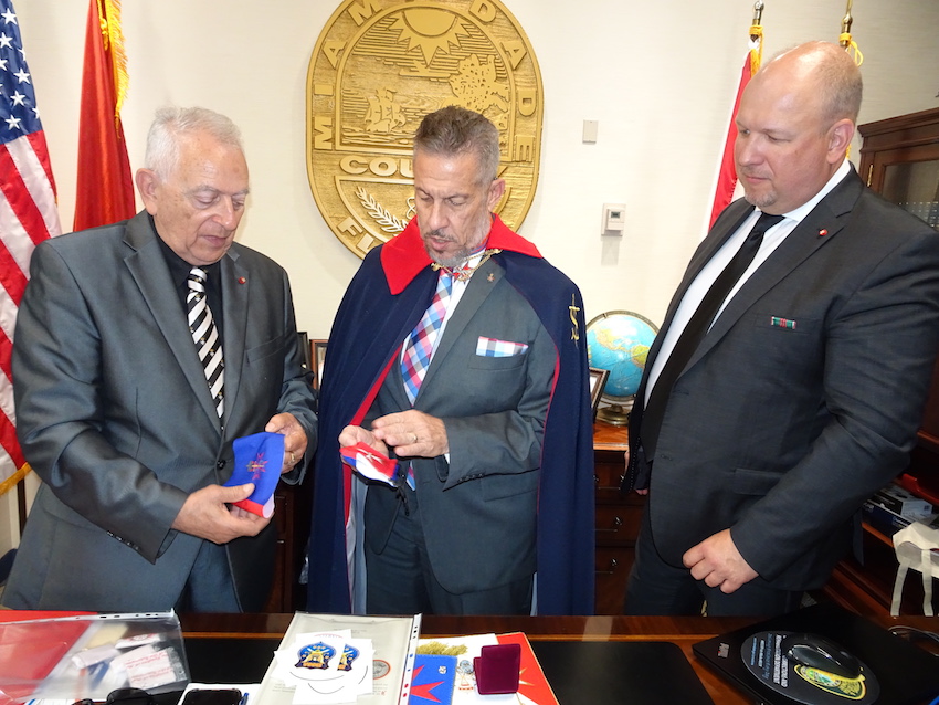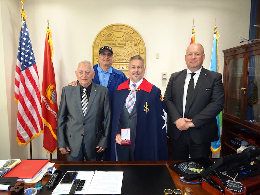 On the 28th February 2022, Sir Jose Pepe Diaz - Knight of Malta received at his office in Miami a delegation of the Sovereign Order of Cyprus – Knights of Sword and Silence, led by H.G. Sir George Popper, Executive Grand Chancellor of the Sovereign Order of Cyprus. On this special occasion, Sir Jose was decorated with the insignia of the Sovereign Order of Cyprus, which is the military branch of the KMFAP, in recognition of his exceptional activity in favour of security in various aspects of the residents of his county. Receiving the blue cape, the neck cross of Cyprus, Sir Jose Pepe Diaz became a Knight Commander of Sword and Silence.
