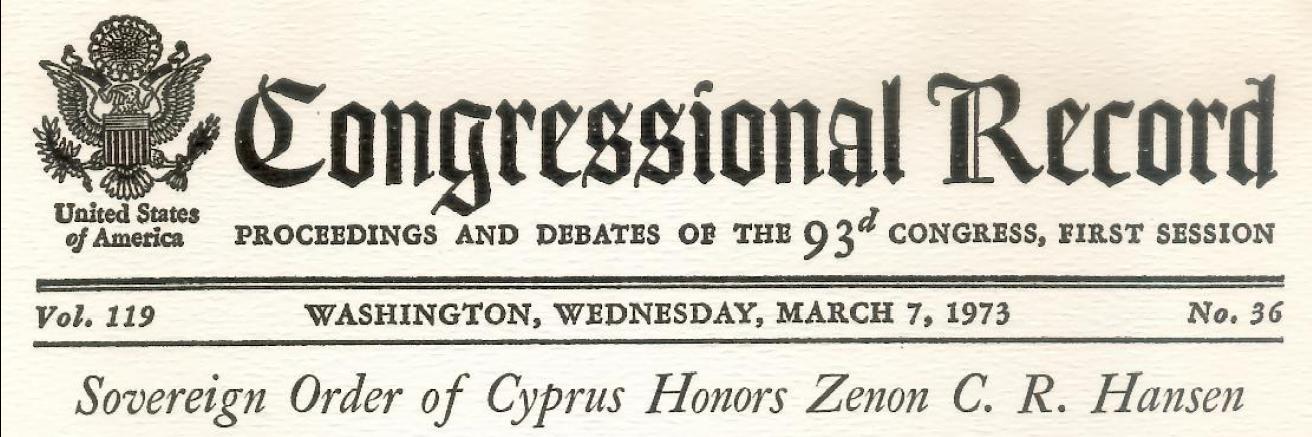 legfontosabb részeit, mely megtisztelő eseményen volt szerencsém részt venni az Egyesült Államok kiemelkedő humanitárius személyisége és hazafija, Zenon Clayton Raymond Hansen, a Mack Trucks Inc. Elnök-Vezérigazgatója meghívásának eleget téve. Elnök úr, a megtiszteltetés, amire utalok, Mr. Zenon C. R. Hansen beiktatási ceremóniája a Szuverén Ciprusi Lovagrend tagjainak sorába.